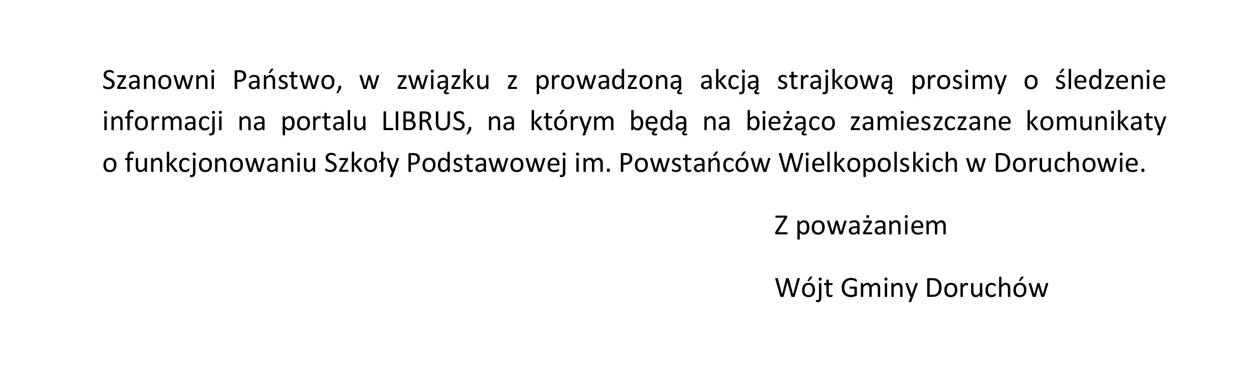 Informacja dla rodziców w związku z prowadzonym strajkiem nauczycieli Szkoły Podstawowej im. Powstańców Wielkopolskich w Doruchowie