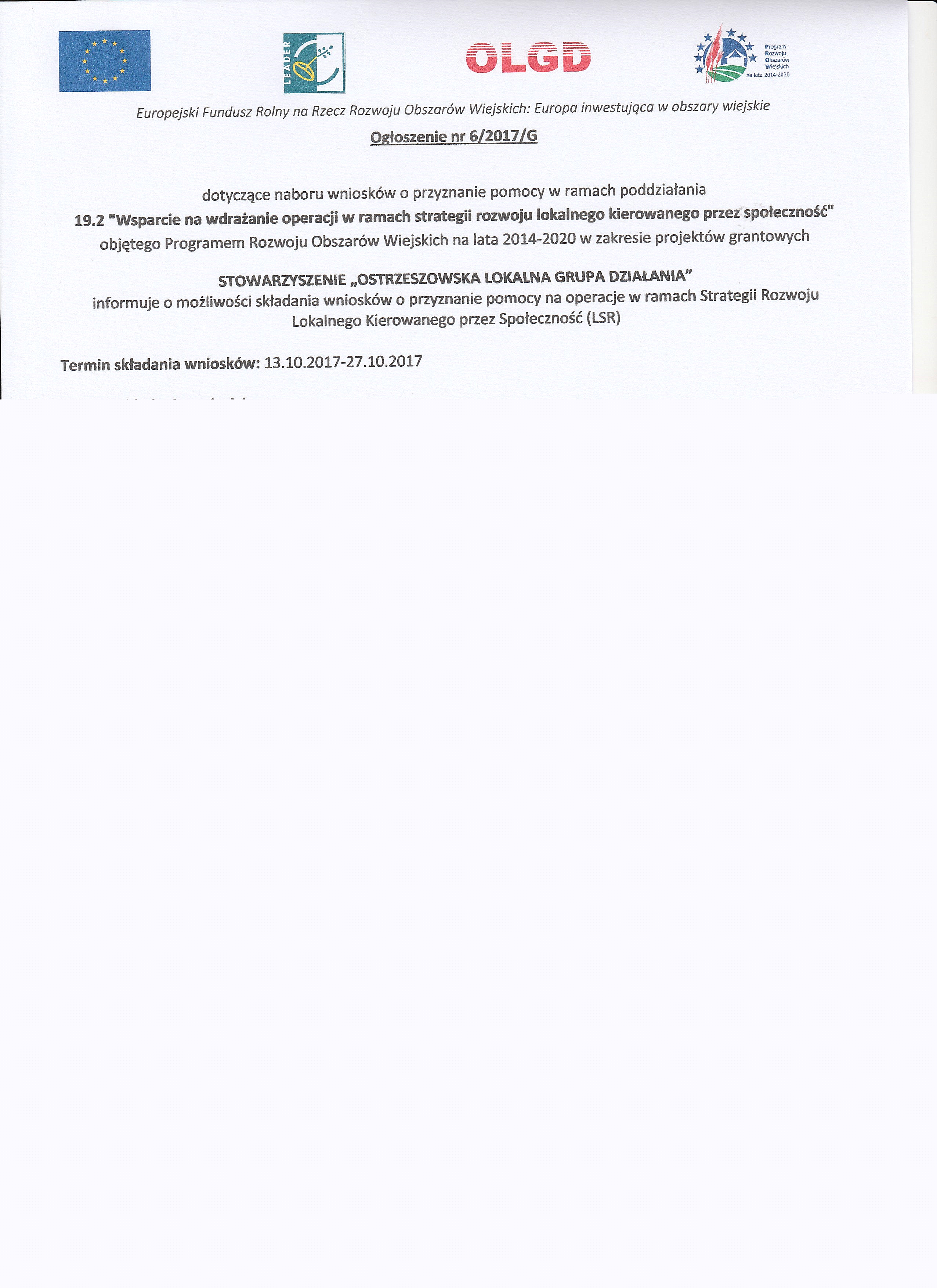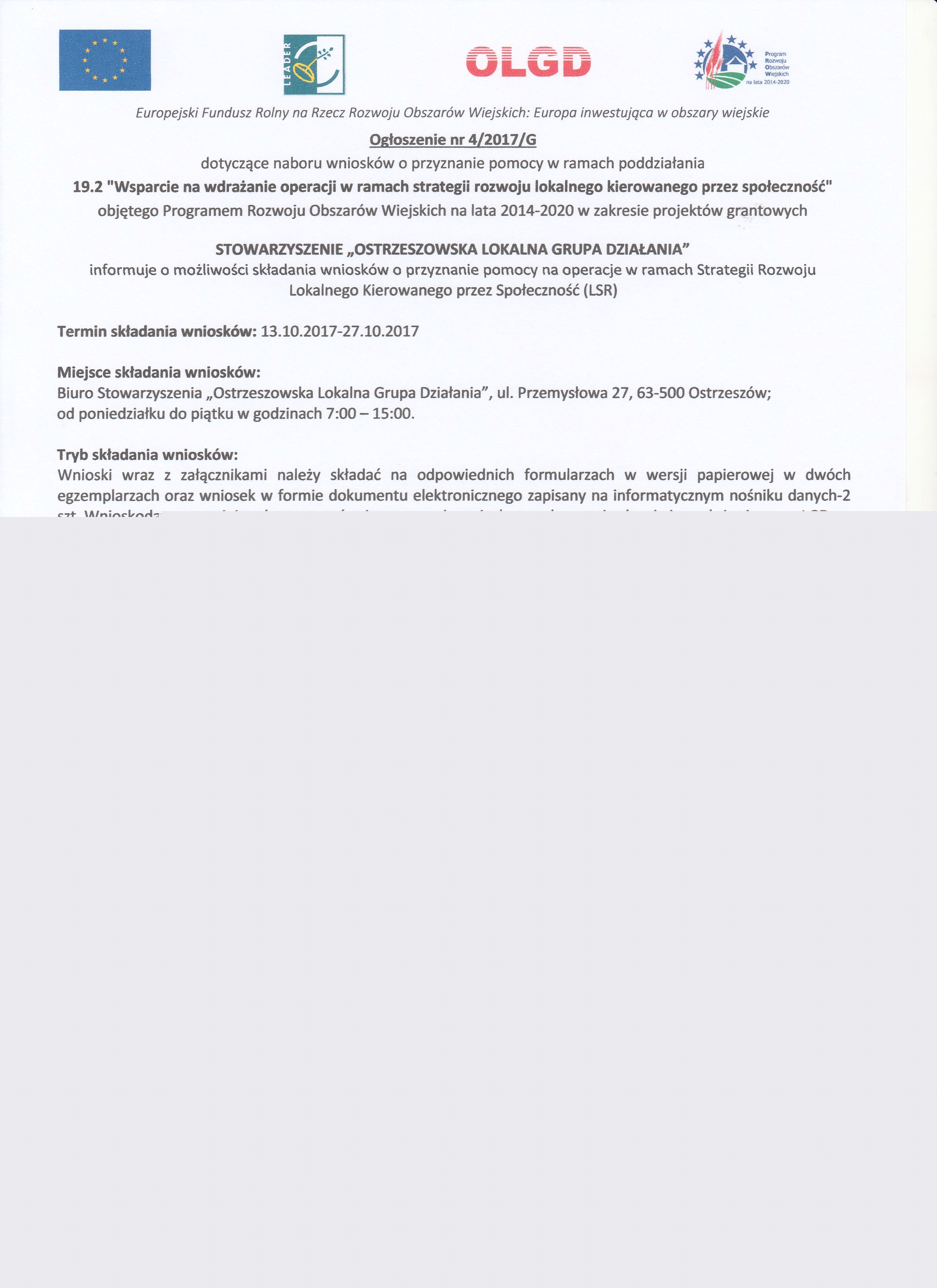 Na prośbę Stowarzyszenia "Ostrzeszowska Lokalna Grupa Działania" zamieszczamy informację o naborze wniosków o przyznanie pomocy w ramach poddziałania w zakresie "Wsparcie na wdrożenie operacji w ramach strategii rozwoju lokalnego kierowanego przez społeczność". Istnieje możliwość składania wniosków w 4 zakresach