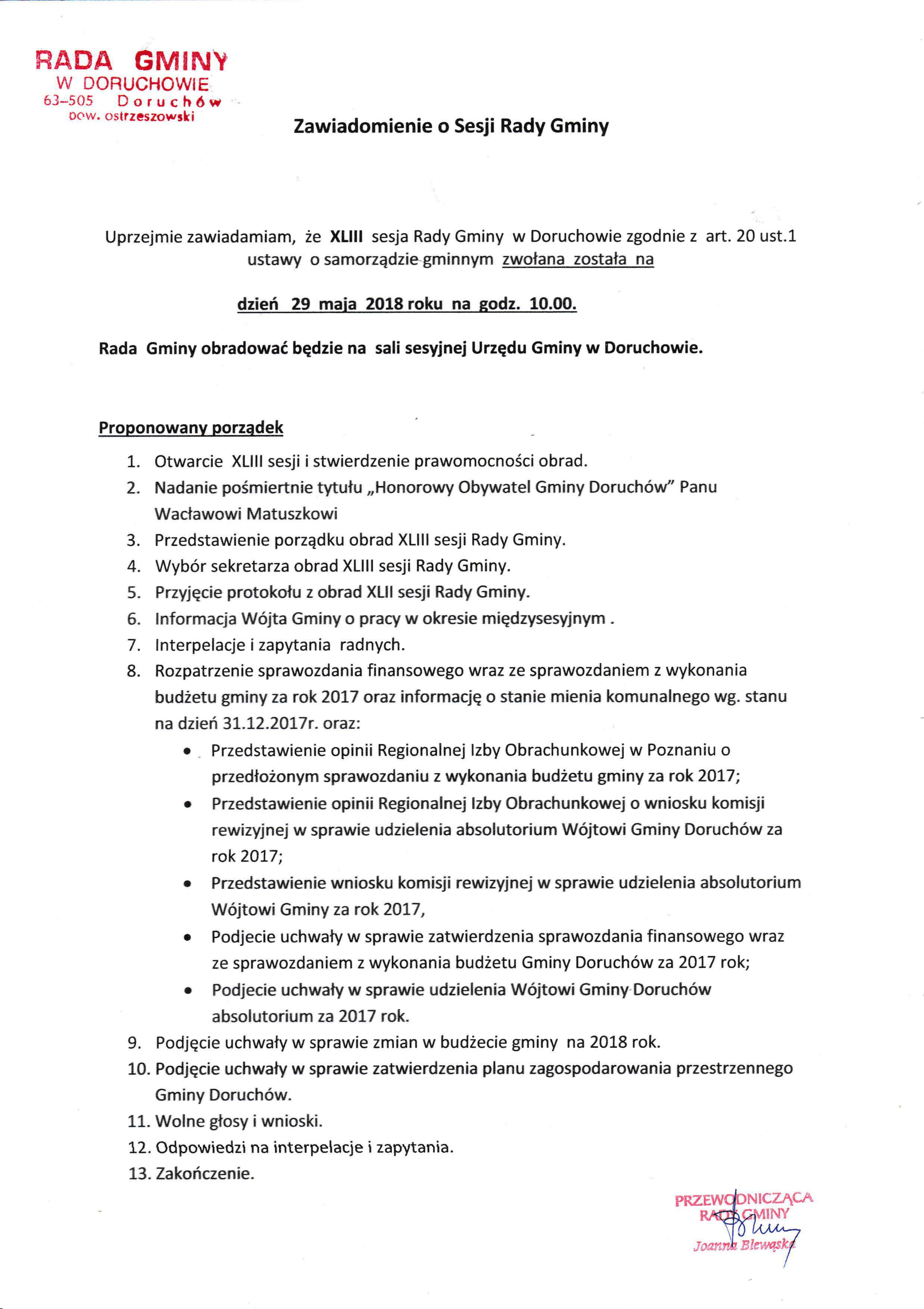 Poniżej zamieszczamy zawiadomienie o XLIII Sesji Rady Gminy w Doruchowie.