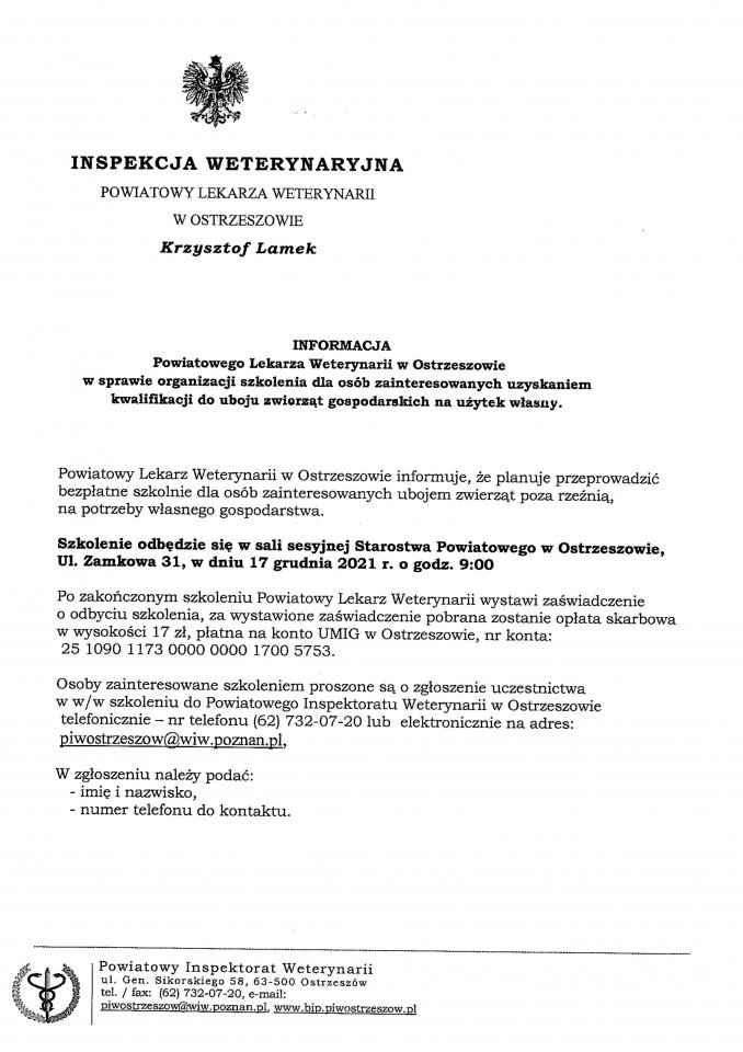 Informacja w sprawie szkolenia - kwalifikacja do uboju zwierząt gospodarstwa domowego