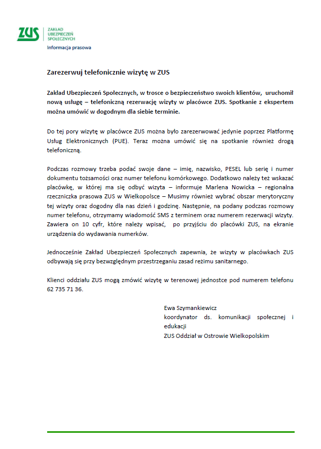 Umów wizytę przez telefon - informacja prasowa ZUS