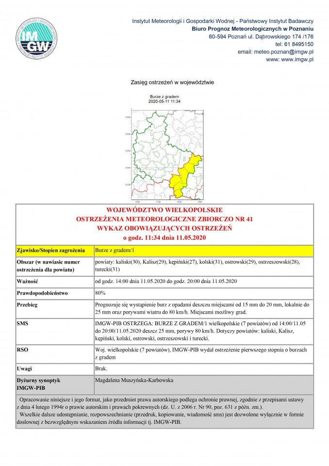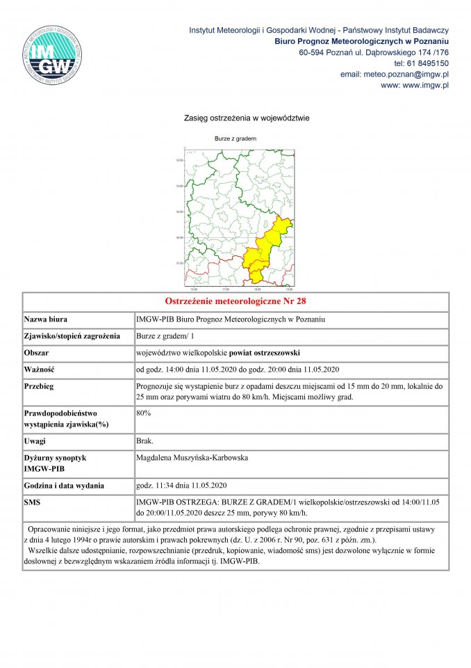 Ostrzeżenie meteorologiczne nr 28 wydane przez Biuro Prognoz Meteorologicznych w Poznaniu.