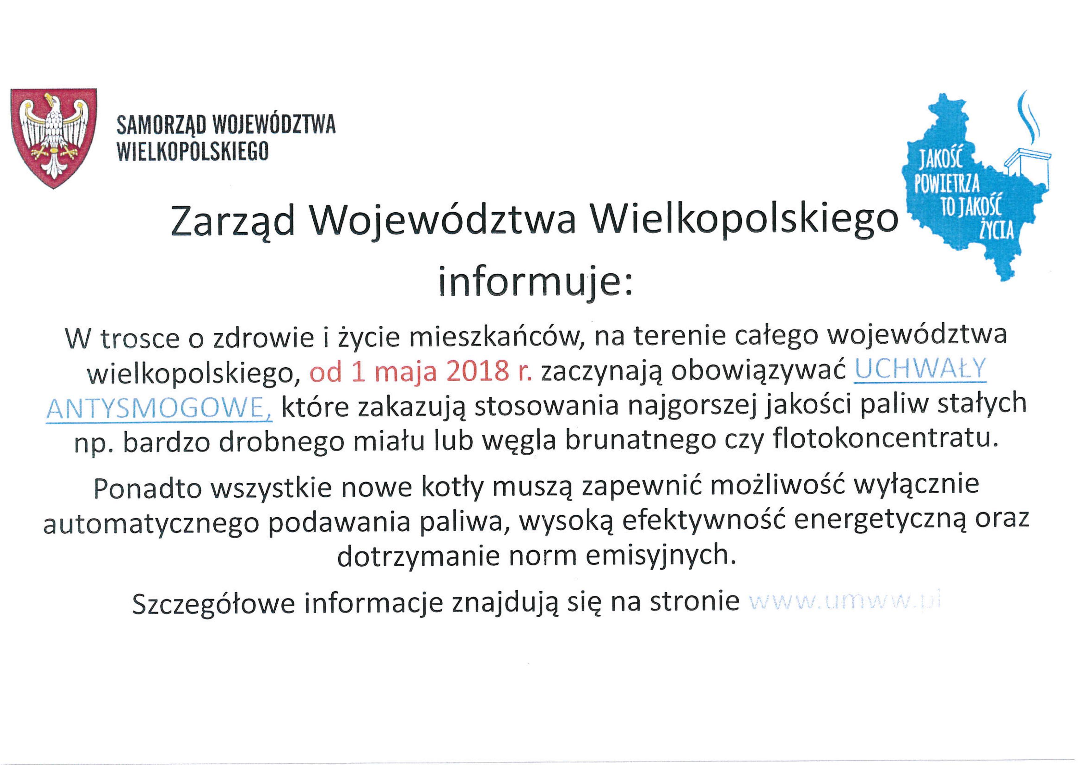 Na prośbę Samorządu Województwa wielkopolskiego zamieszczamy informacje dotyczącą uchwały antysmogowej.