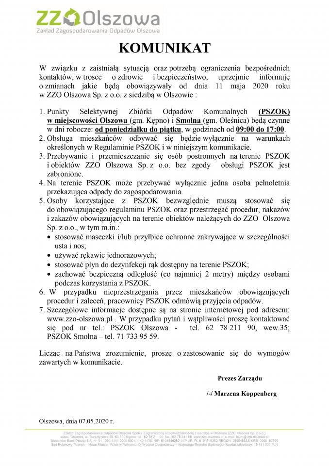 Komunikat ZZO Olszowa - nowe warunki funkcjonowania