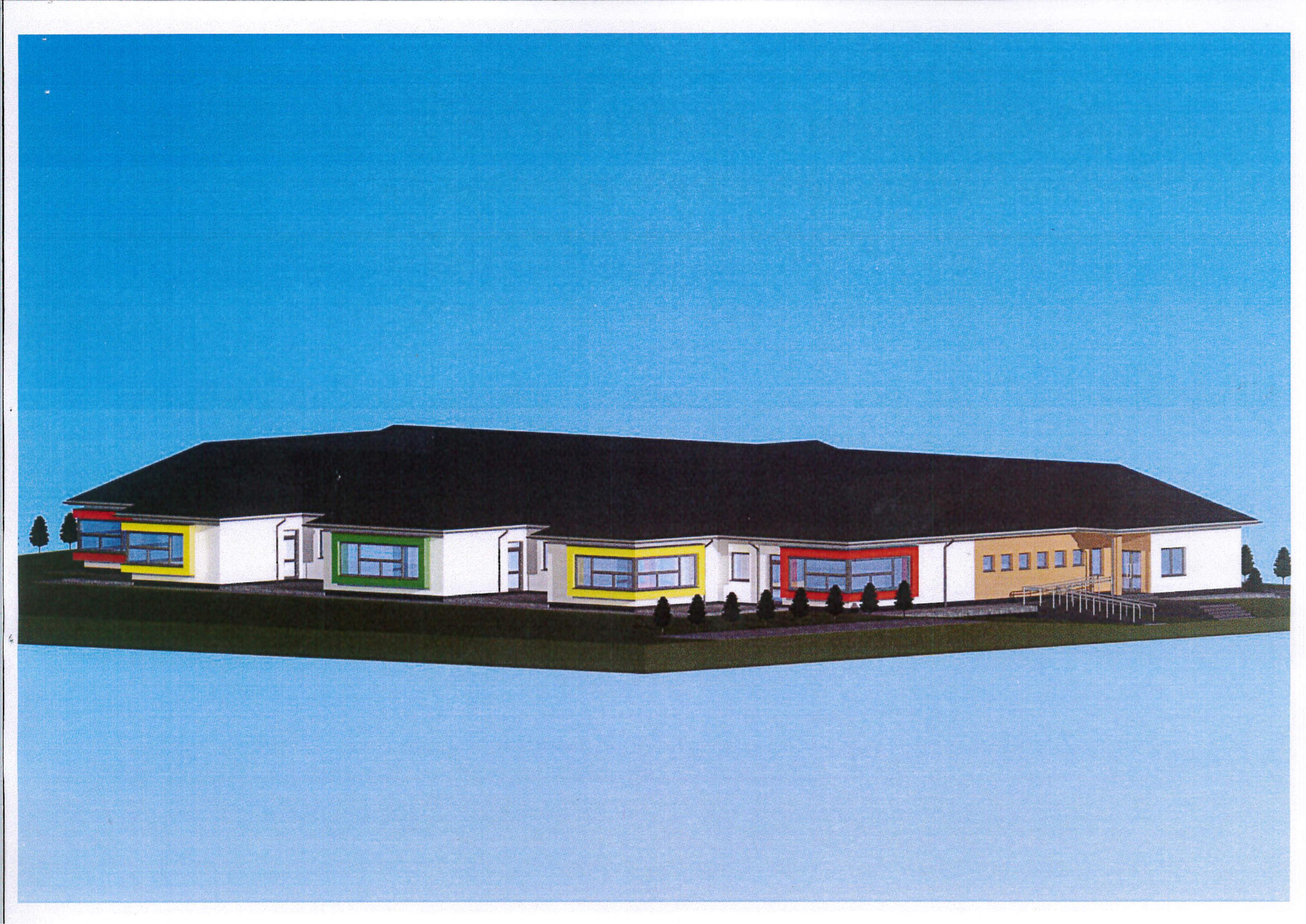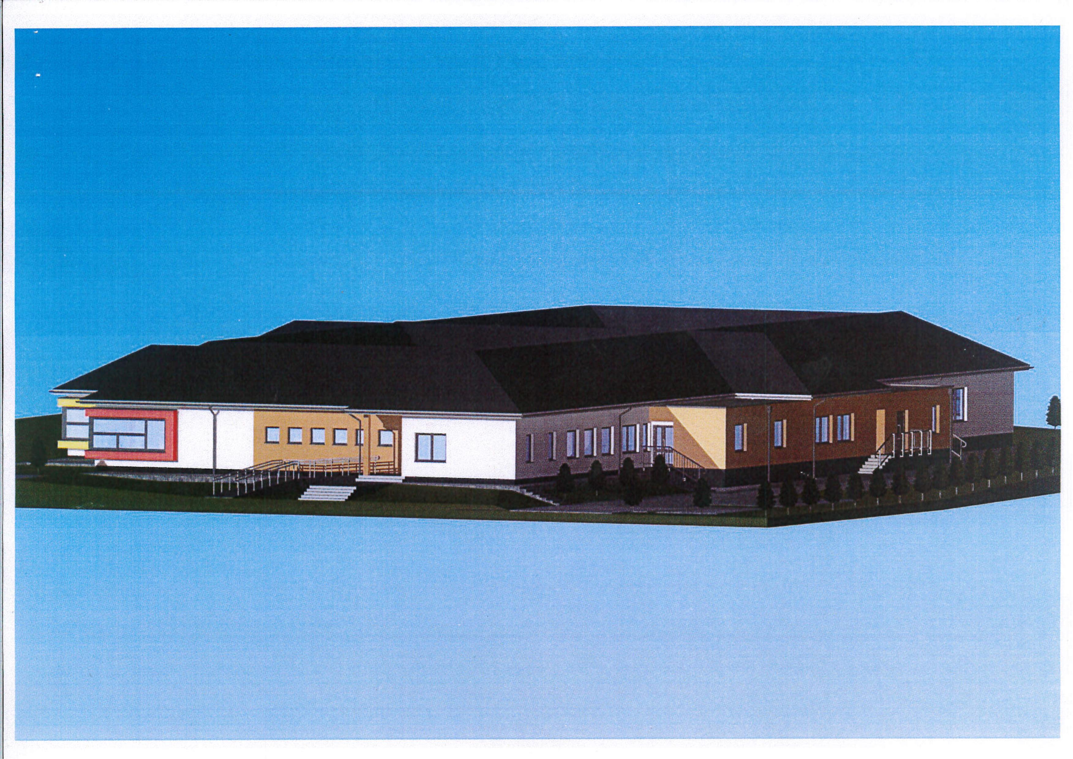 Drodzy mieszkańcy, zgodnie z prośbą zamieszczamy wizualizację nowego przedszkola. Pierwsze zdjęcie prezentuje przedszkole od strony hali i główne wejście, a drugie obrazuje główne wejście i przedszkole od ul. Szkolnej.