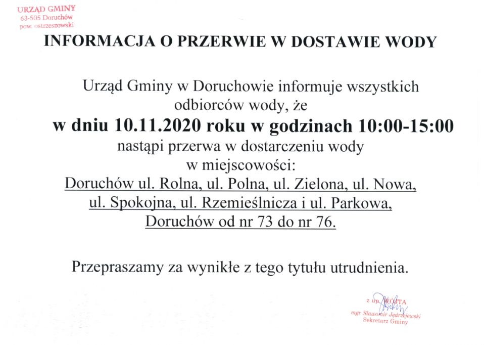 Informacja o przerwie w dostawie wody