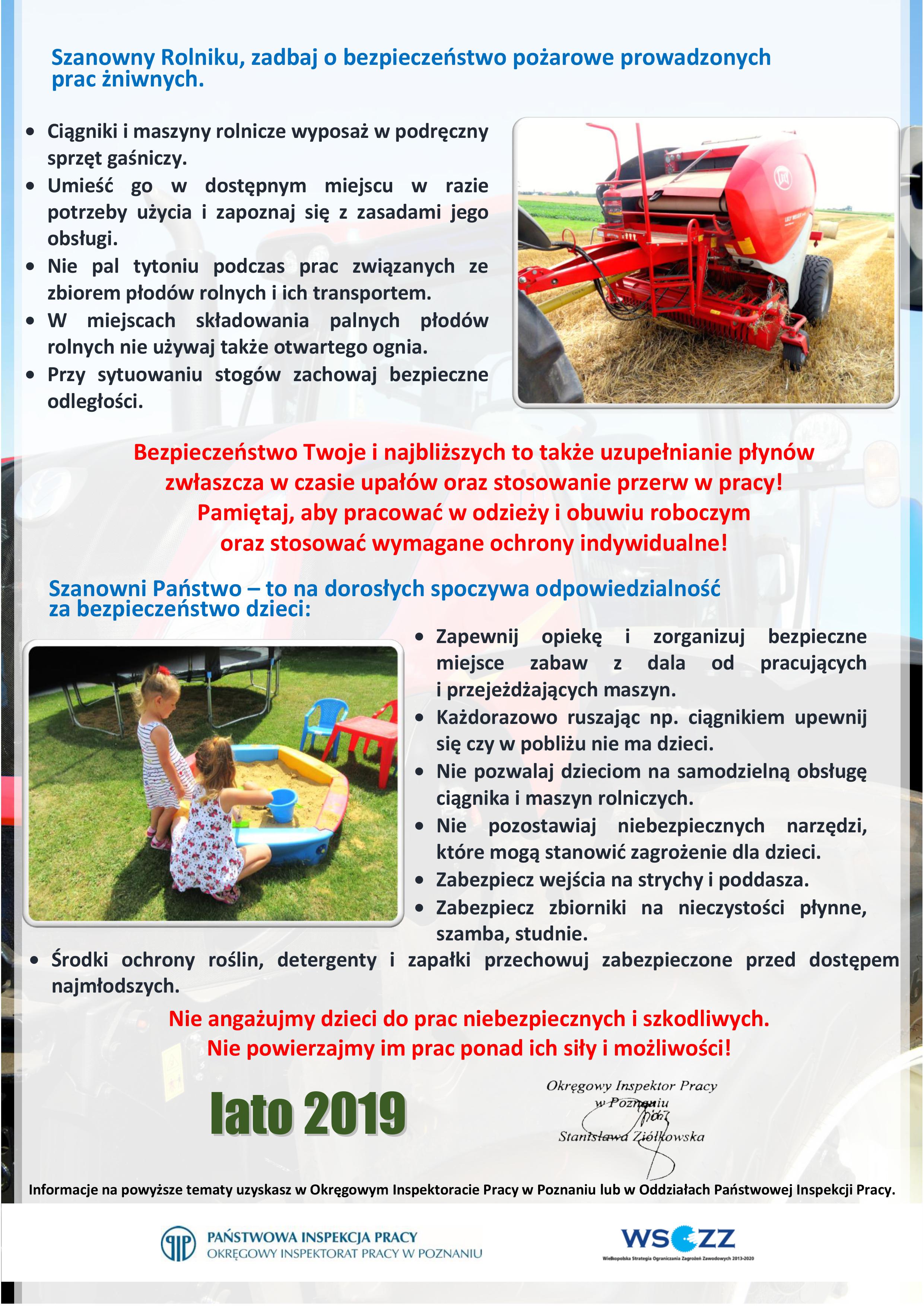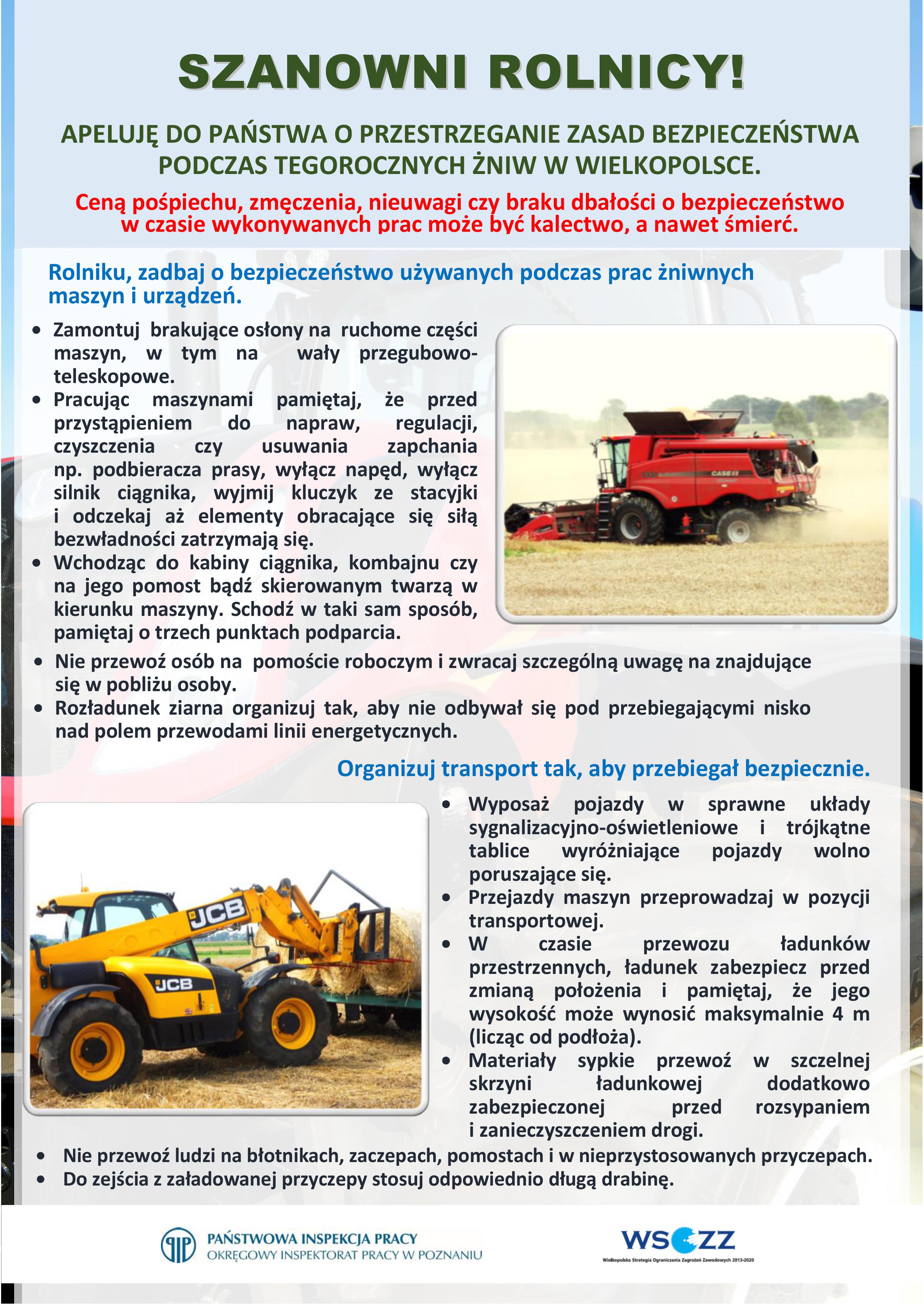 Przekazujemy skierowany do rolników apel Okręgowego Inspektora Pracy w Poznaniu o przestrzeganie zasad bezpieczeństwa podczas tegorocznych żniw.