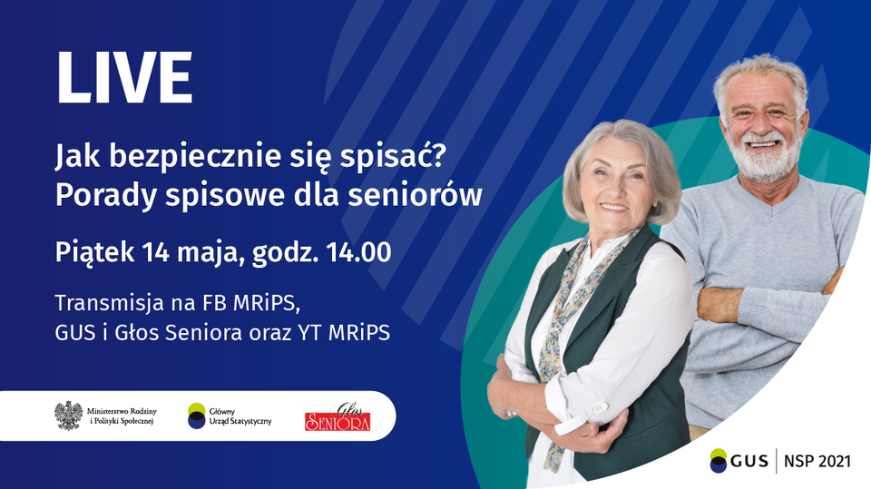 Gminne Biuro Spisowe serdecznie zaprasza na dziejsze spotkanie tj. 14 maja o godzinie 14:00 pt. „Jak bezpiecznie się spisać? Porady spisowe dla seniorów” organizowany przez Ministerstwo Rodziny i Polityki Społecznej, Głos Seniora i Główny Urząd Statystyczny.