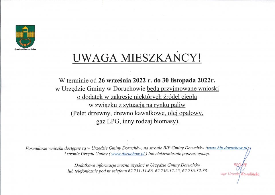 Od 26 września w Urzędzie Gminy Doruchów będą przyjmowane wnioski o dodatek do niektórych źródeł ciepła