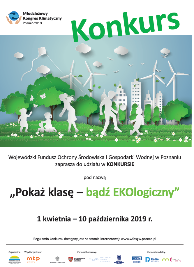 Wojewódzki Fundusz Ochrony Środowiska i Gospodarki Wodnej w Poznaniu serdecznie zaprasza młodzież szkół ponadgimnazjalnych/ponadpodstawowych z województwa wielkopolskiego do wzięcia udziału w konkursie pn. „Pokaż klasę-bądź EKOlogiczny”. Celem Konkursu jest zwiększenie świadomości ekologicznej Uczestników Konkursu oraz społeczności lokalnych. Uczestnicy Konkursu zgłaszają akcje i działania służące osiągnięciu celu konkursu przedstawione w formie krótkiego filmu.