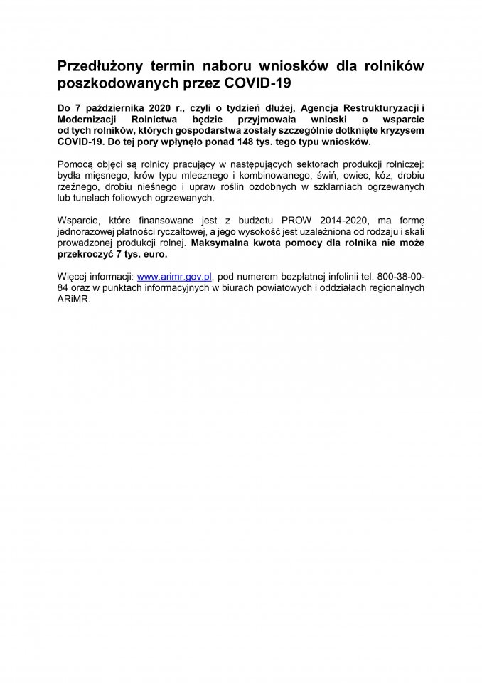 Przedłużony termin naboru wniosków dla rolników poszkodowanych przez COVID-19