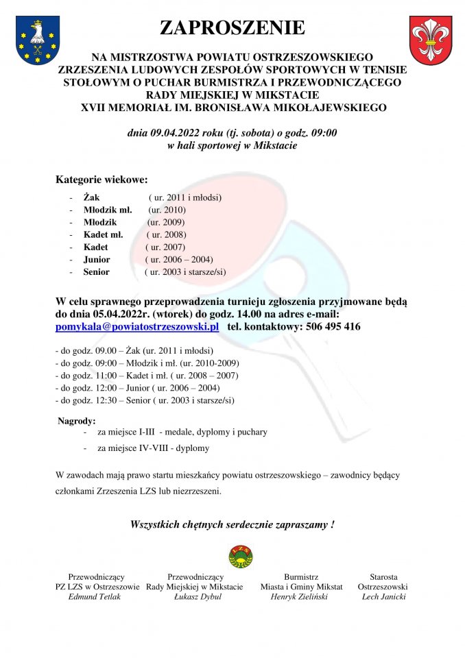 Zaproszenie z rozpiską godzinową na Mistrzostwa Powiatu LZS w tenisie stołowym w dniu 9 kwietnia 2022r. w Mikstacie