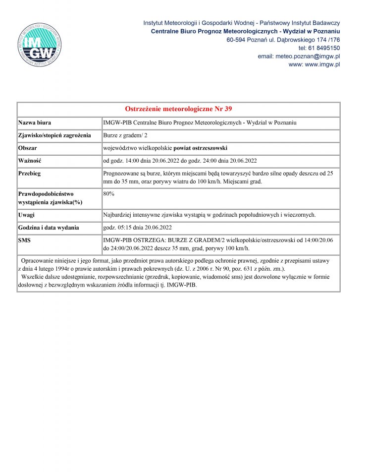 Ostrzeżenie meteorologiczne nr 39 wydane przez Biuro Prognoz Meteorologicznych w Poznaniu.